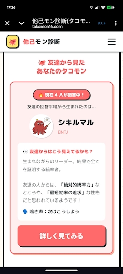 こんばんは!しゅりです! みなさん、他己モン診断ってご存知ですか?🐙 友達に 『あなたから見て○○さんはどんな人?』 という質問をいくつか答えてもらうことで、 他者から見たわたしを知れるという診断なのですが…… 友達に答えてもらったら、 『えー!わたしのこと、そんな人やと思ってたの!?』ってなり、 実際のわたしと比較して楽しめました😂 みなさんも是非やってみてください!✨ 今日もよろしくお願いします!