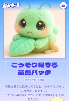 こんばんは! あんずです🐹 相変わらず 流行りに乗り遅れておりますが 『Koiキャラメーカー』なるものを やってみましたっ AIからの質問に 何個か答えるだけで 簡単に診断出来るやつ🐶 ほんまにすぐ出来た🌟 ほんで気になる(?) 診断結果 こっそり見守る 遠慮バッタ!!!! バッタ…………………??? え、バッタっすか。 虫とかアリなんや。 まずそこで引っかかってしもた。笑 まあバッタは一旦置いといて…(´ー`) 普段は静かに見守ってるけど 心の中ではあれこれ考えてるタイプ。 割と合ってたりするかも😶 思ってることは そんなにすぐ言わんかも。 色々考えつつ見守っちゃうかな〜 言わないといけないタイミングの時は ちゃんと考えてること伝えるように 努力してるけど 言えない時もあるんだよなぁ… これは控えめな優しさとは 違うと思うけど なんやかんや心の中で 色々考えてることが 人の心を掴むきっかけに なってたら嬉しいですねぇ😮💨 こんな感じで 人のことこっそり見守ってます🙋♀️🔍 あと「聞き上手」って書いてるけど 個人的には「聞き上手」ではなくて 「聞く専門」が合ってます。笑 こういう診断って 楽しいから好きやわ〜 色んな人の診断結果も見てみたいし 他にもこういうやつやってみたい😆 バッタ(私)は 今日お休み満喫します💤 また火曜日から営業ですので よろしくお願いします😌✨